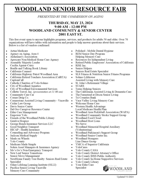 City of Woodland Senior Resource FairThu 5/23/20249am1pm