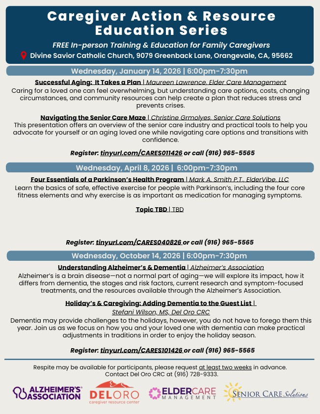 Join us in Orangevale for the Caregiver Action & Resource Education Series to get helpful tips and support!