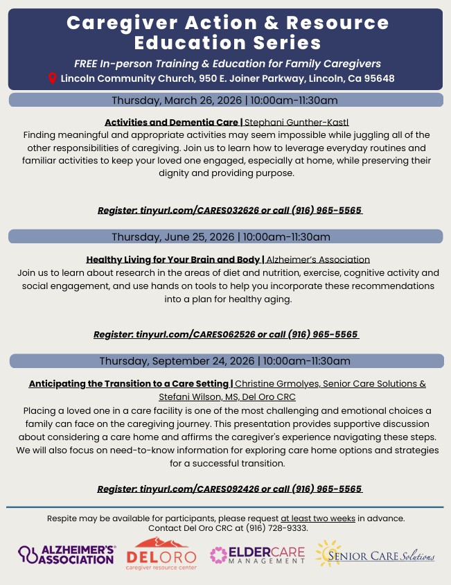 This unique collaboration among the Alzheimer’s Association, Del Oro Caregiver Resource Center, Elder Care Management, and Senior Care Solutions, offers educational classes each season to address different aspects of the caregiving journey.