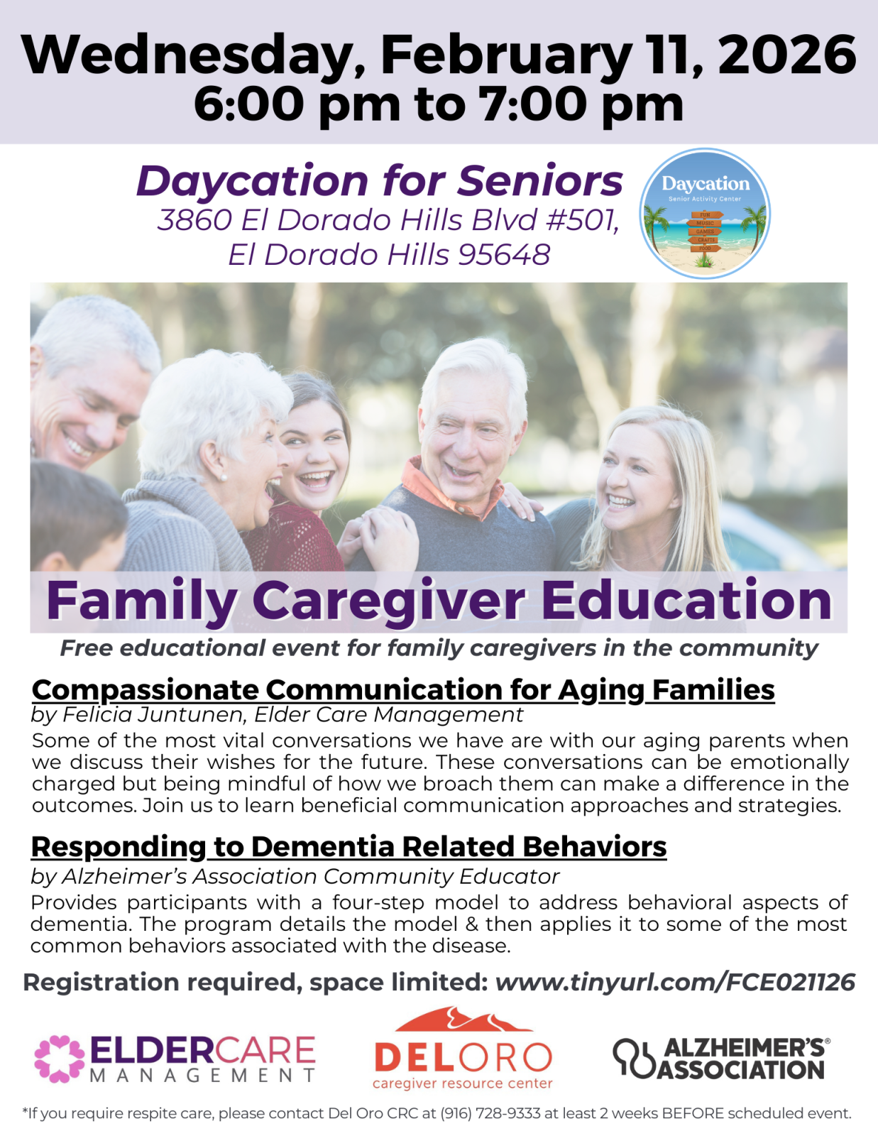 Join us for this FREE Family Caregiver Education for family caregivers in the community, brought to you by the Alzheimer’s Association, Del Oro Caregiver Resource Center, and Elder Care Management. Hosted by Daycation for Seniors of El Dorado Hills.